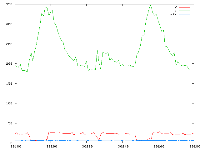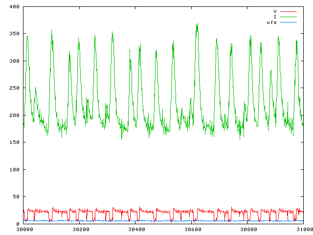 Weld recorded as being a good welding condition. The downward transients on the voltage at around the 11000th data point have no duration and caused no spatter or other misbehaviour.