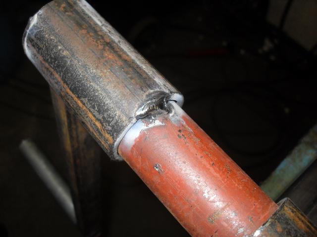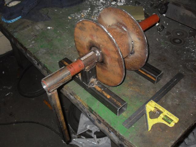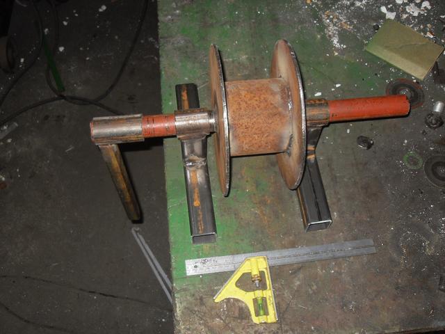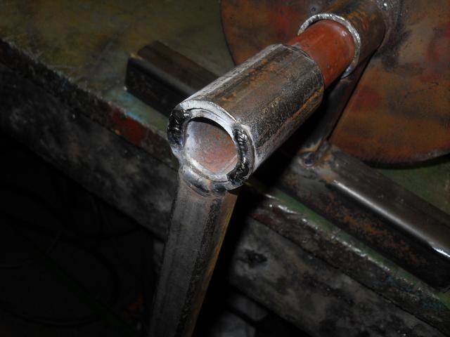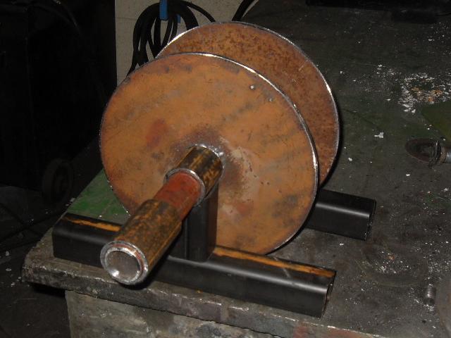 The stand and bearing assembly isn't welded at all yet. Had a short good session getting from zero to ready to weld off, then quit while I was ahead.