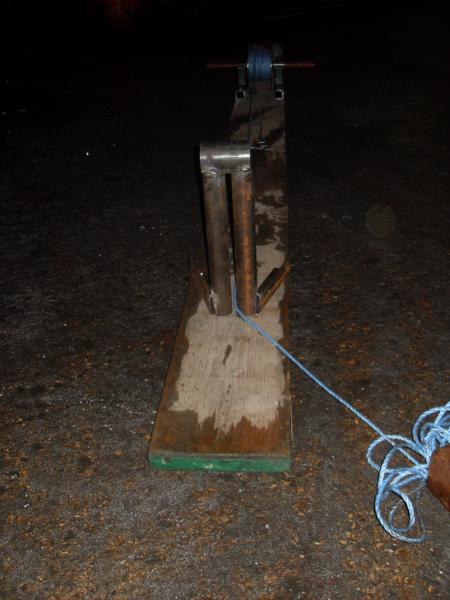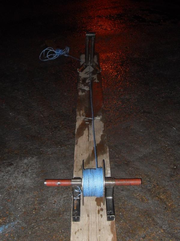 Made fairlead and screwed winch and fairlead to scaffold plank with wood-screws. (removed handle from winch - attachment was low-current low-penetration Rutile welds for exactly this reason)