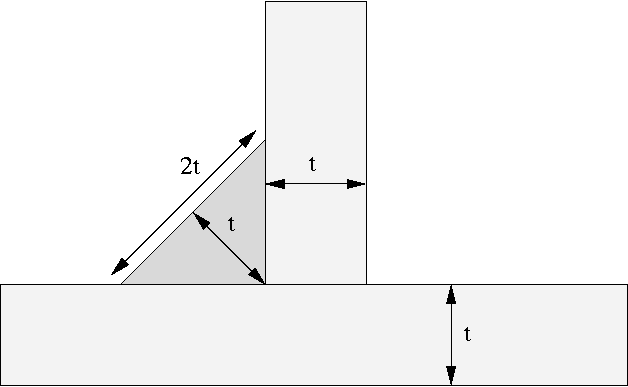 From this it can be seen, by simple geometry, that the aim fillet size should be that its leg length is twice the thickness of the sheet or plate metal you are welding.