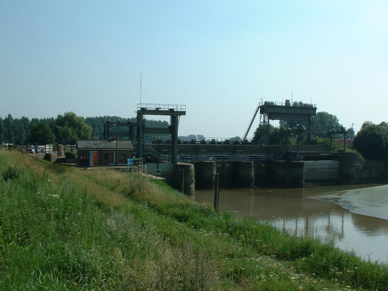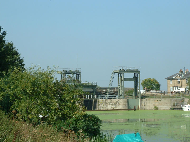 The rivers in the Cambridge area and from/through the Fens to the North of Cambridge flow to Denver Sluice, which lets them flow to the sea at low tide. This is the first stage of the draining of the Fens. If you only open the sluice at low tide, you lower the water-level of the river system to the low-tide level. It still leaves the drained Fens below river levels, to which they have sunk on draining, from which water must be pumped up to the rivers so it can flow to the sea at Denver Sluice. The sluice at Denver is not the only one on the Fens, but it is probably the most famous.