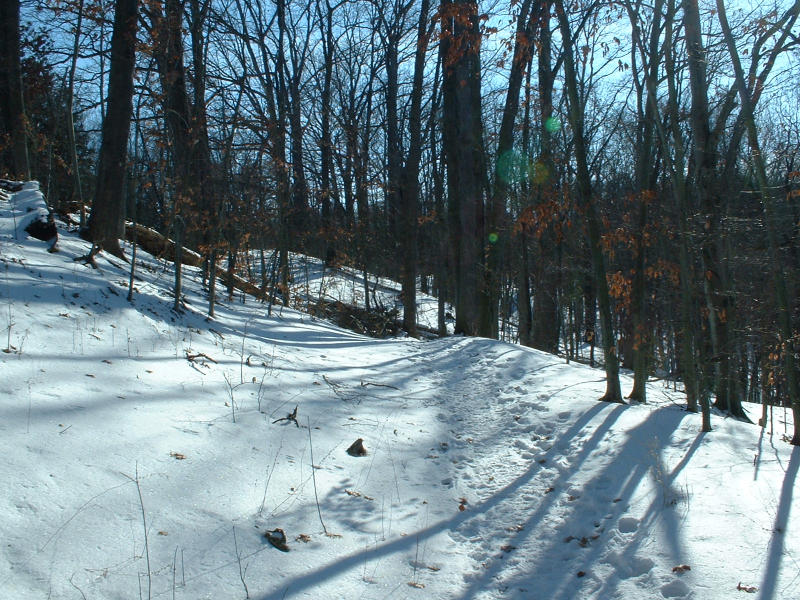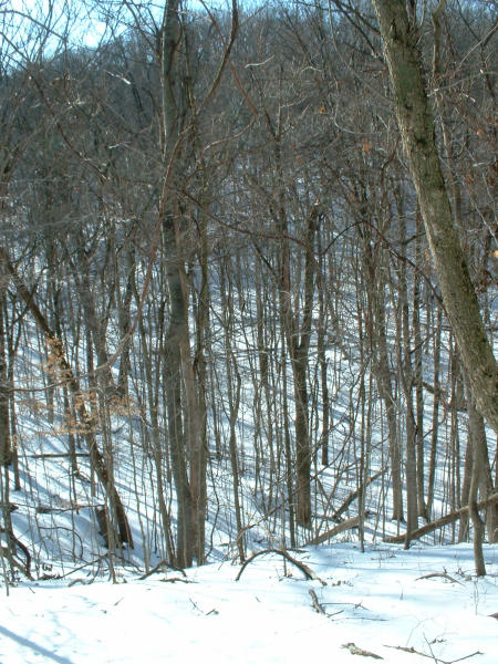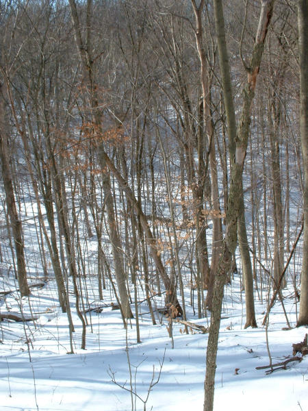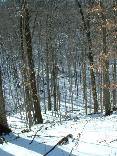 Most of Ohio is at least slightly rolling, going to moderately hilly mainly to the South side of the State. Here in the North-East, this is a typical scene - rolling countryside of small streams in little valleys, covered with deciduous woodland. This is in early February of 2003. Compared to surrounding days, this was a moment of mildness, with temperatures rising to near freezing/thawing temperature and winter sunshine - bright but not warm.