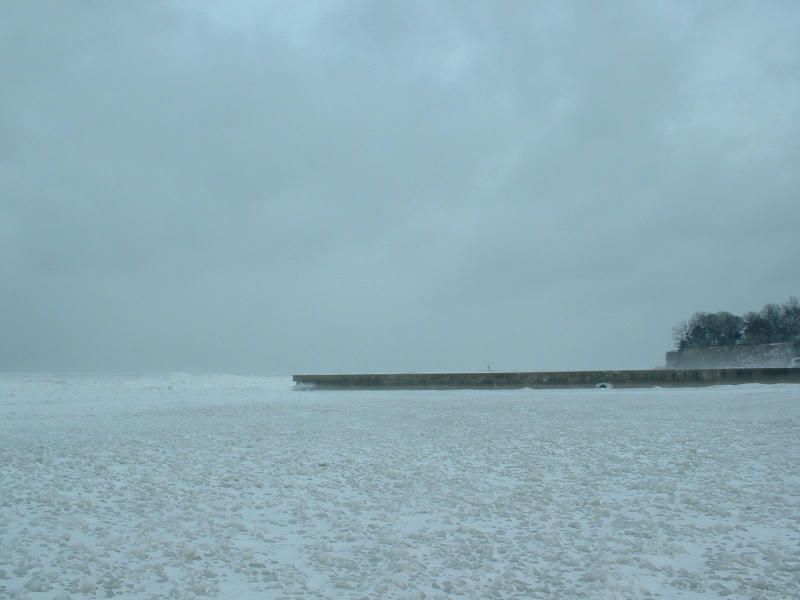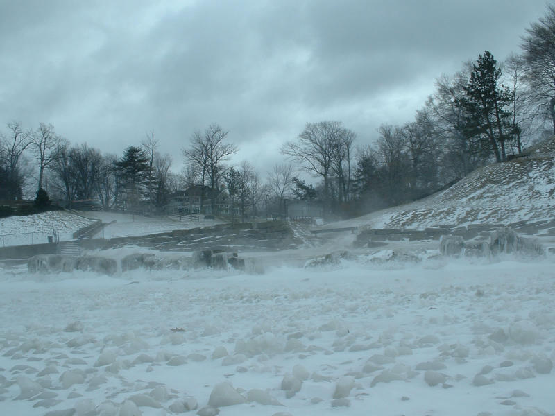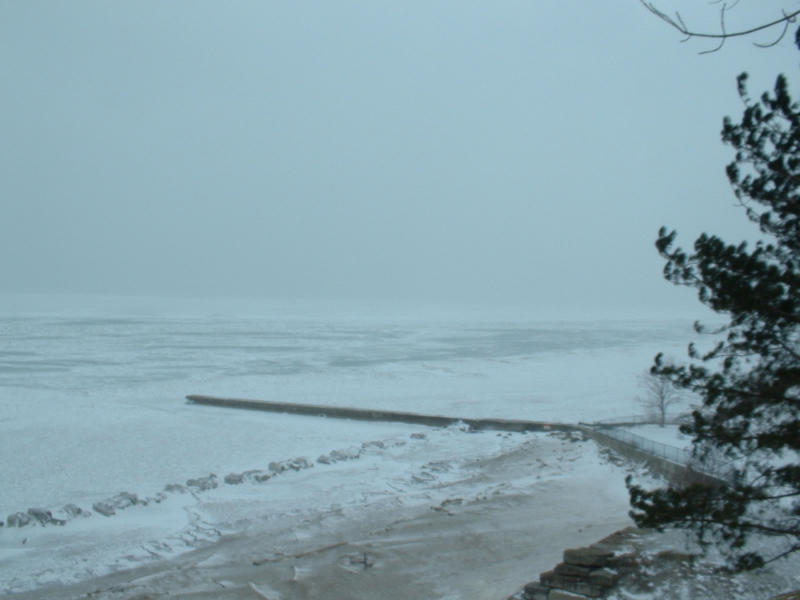 In all pictures of this series, the white smokiness, often looking like blurring, is drifting snow, on a constant wind of a few tens of miles-per-hour. The last picture, looking over Lake Erie from the knoll at Rocky River park is not camera-shake blurred, I think - it is the drifting snow greying-out the picture.